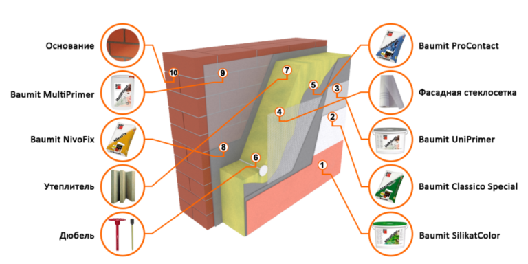 Устройство мокрого фасада подразумевает использование разнообразных водных растворов штукатурки, грунтовки, красок. Суть в том, чтобы создать на поверхности стены многослойную структуру, которая и будет защищать от холода. Для этого в определенной последовательности наносится клей, теплоизоляционные материалы, грунтовка и т.д.